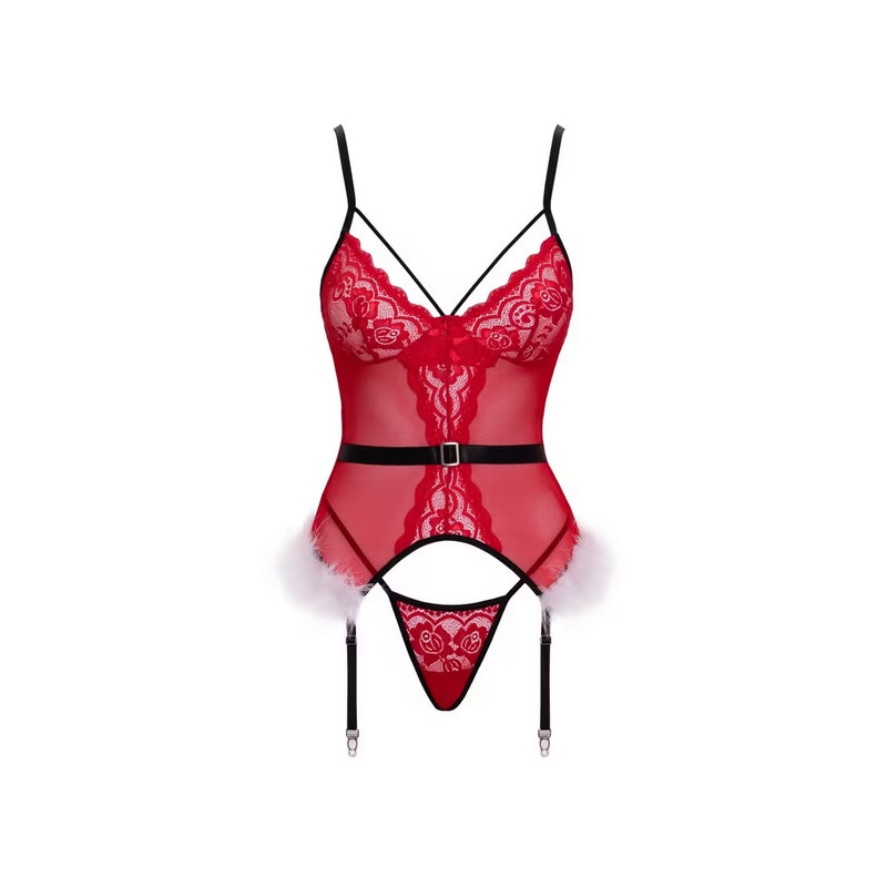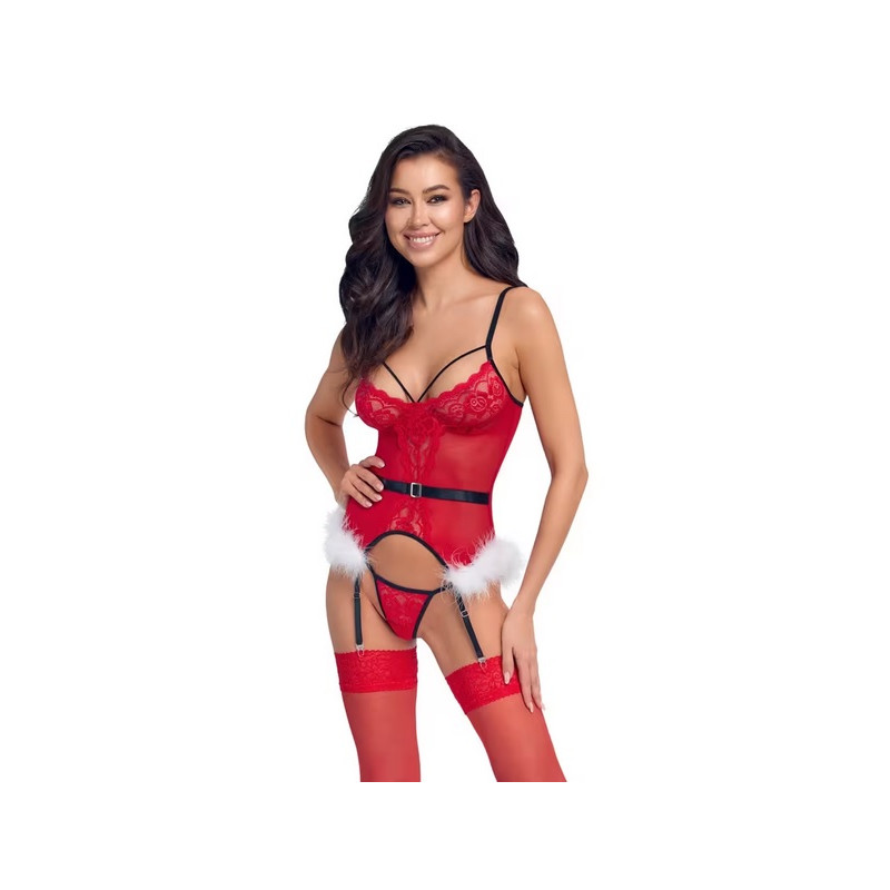 Strapshemd und String im Set X-Mas von Cottelli LINGERIE. Rotes Powernet und feine Spitze Ton in Ton. Rundum weich und elastisch für vollen Tragekomfort. Dazu schwarze Details und zarter weißer Federbesatz seitlich an den Hüften. Spitzen-Cups mit schmalen Cup-Riemchen, in der Taille vorne ein dekorativer aufgesetzter Ziergürtel. Die Träger und Strumpfhalter sind passend verstellbar. Der kleine Spitzen-String komplettiert den verführerischen Festlook.